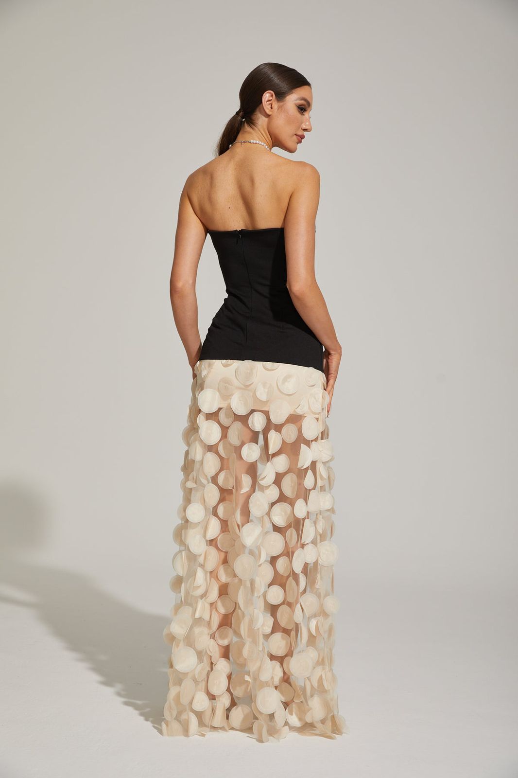Vestido de noche strapless con cuerpo negro ajustado y falda transparente marfil con aplicaciones 3D. Elegante, moderno y perfecto para eventos especiales.